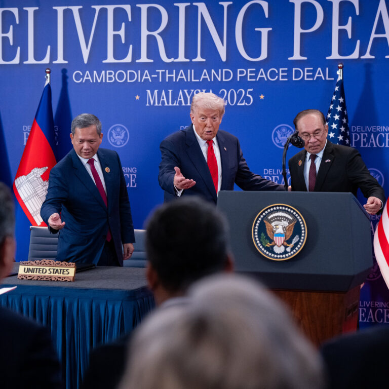 PHNOM PENH, Kamboja – Presiden Amerika Serikat Donald Trump pada 27 October 2025 mengawasi momen bersejarah penandatanganan Pakta Damai Kamboja-Thailand,...